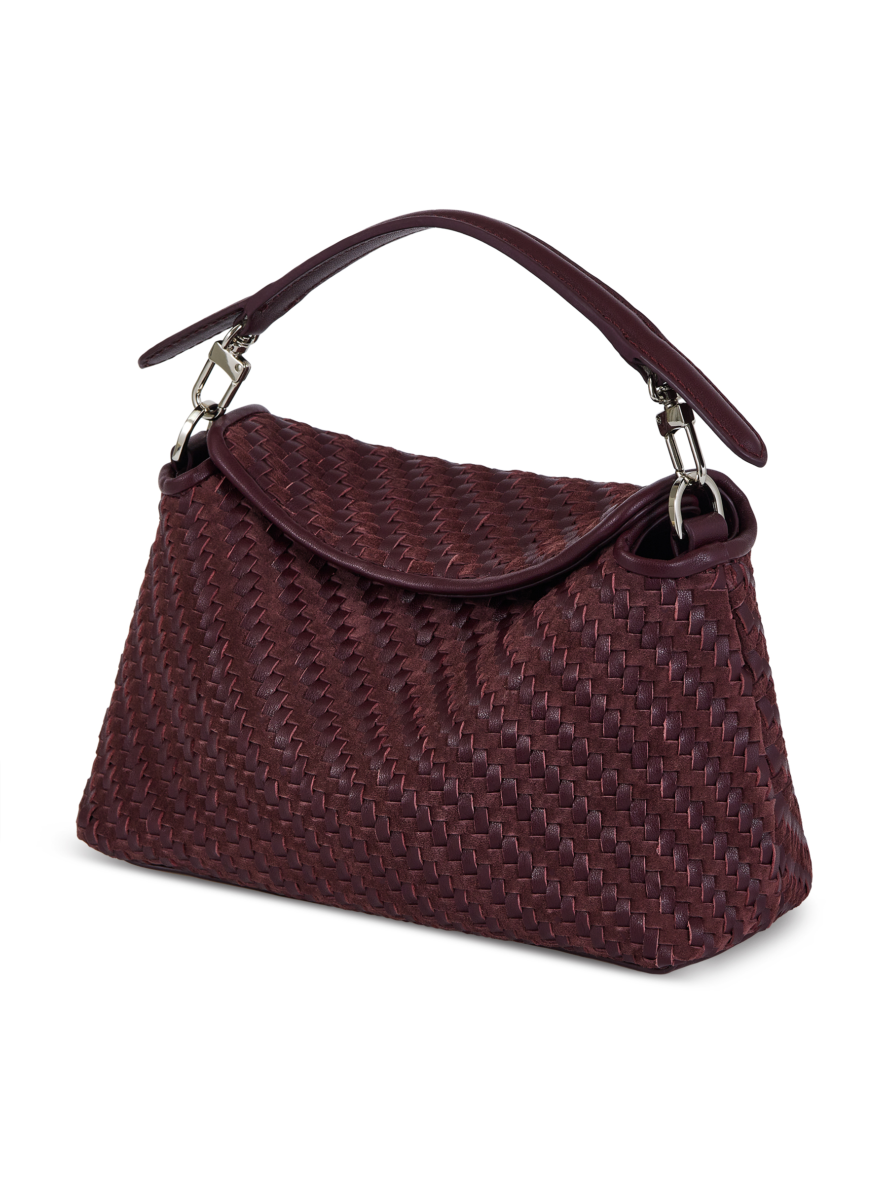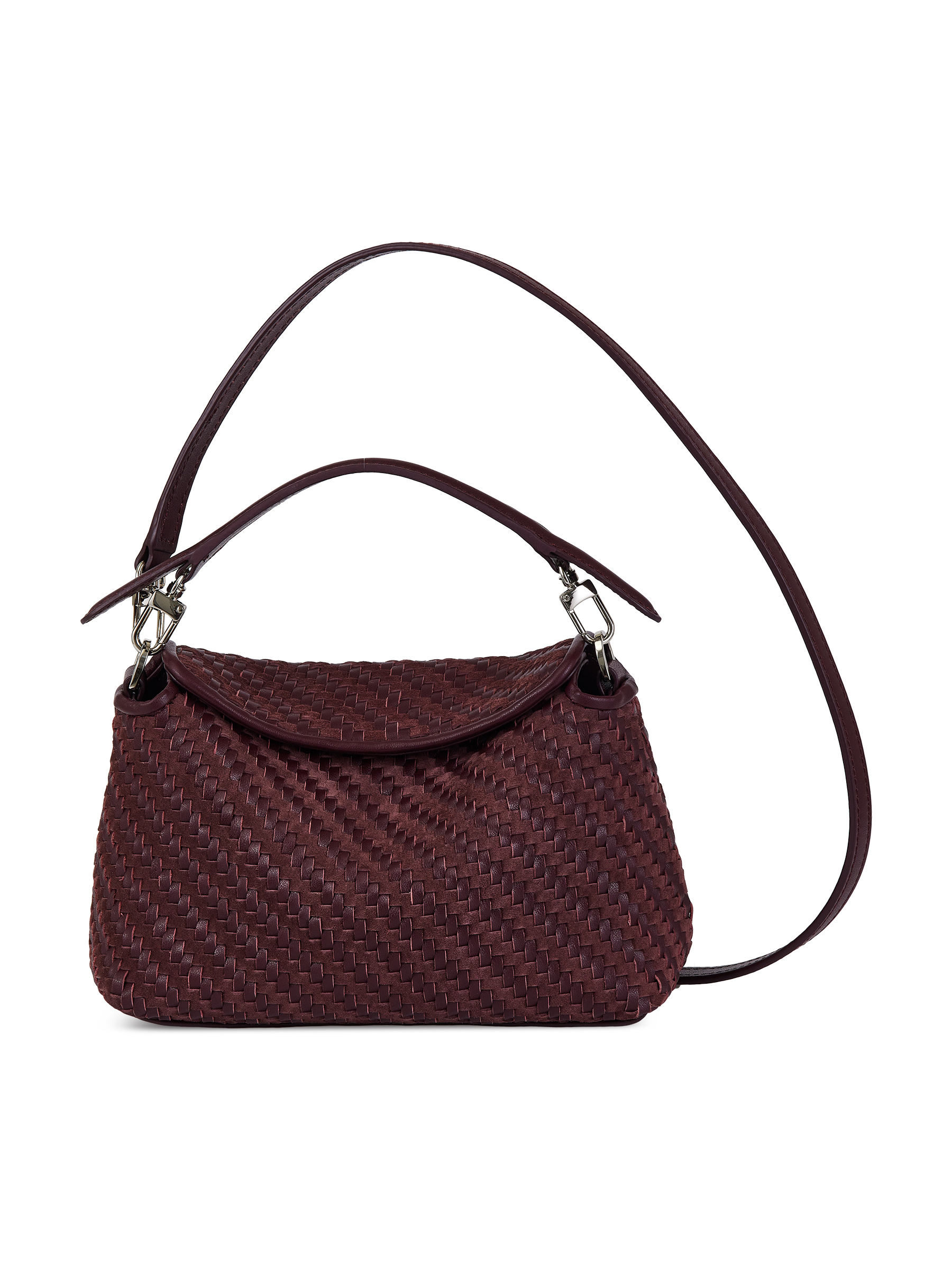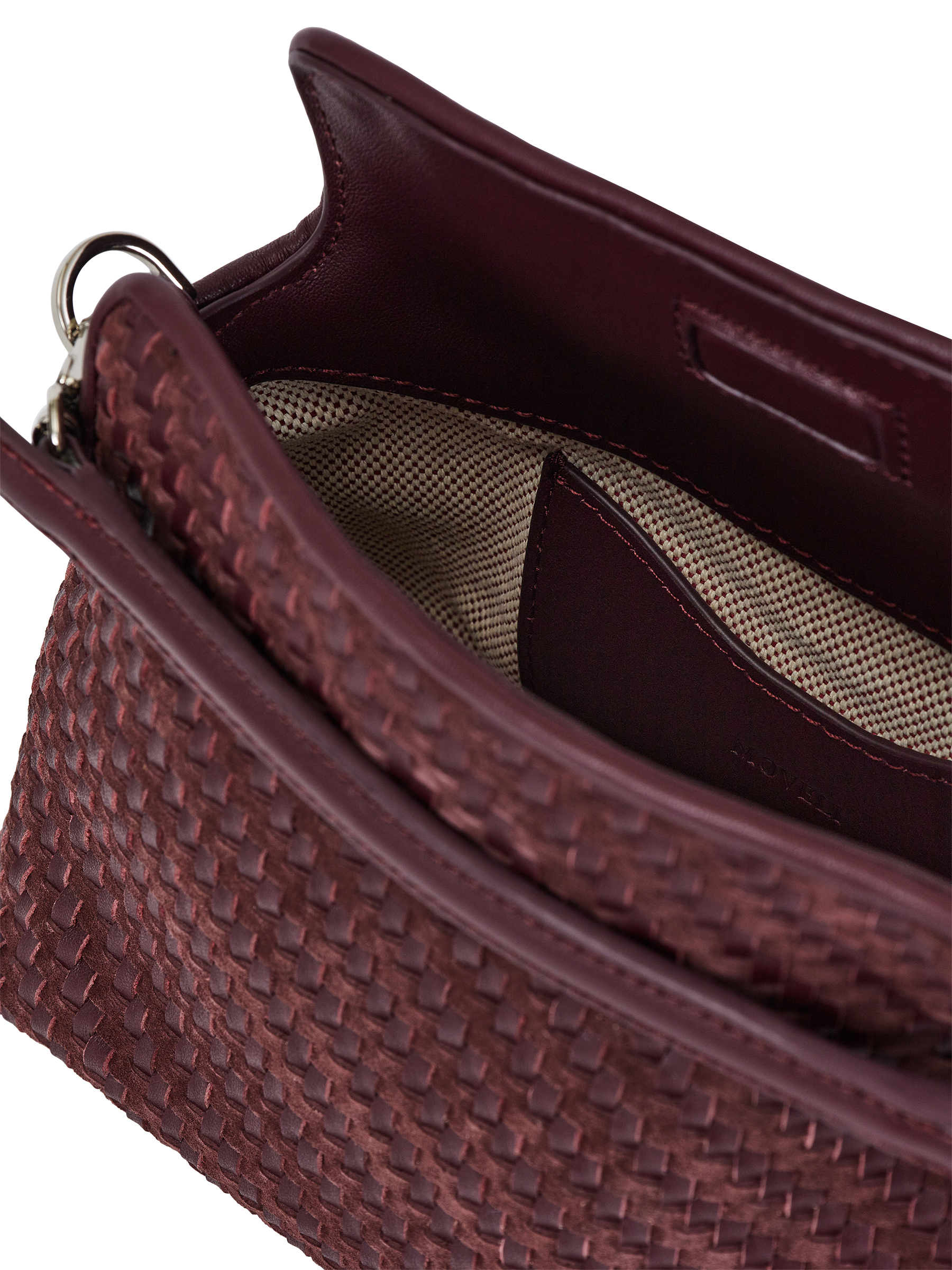 Натуральная кожа, плетеная фактура; хлопковый подклад; кожаный карман для карточек; съемная ручка; плечевой ремень.